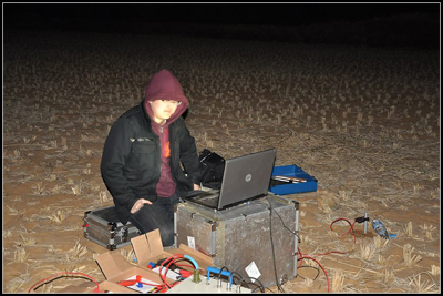 在测量过程中,中央电视台焦点访谈栏目组进行了跟踪采访。12点左右完成了测量。该地点环境噪声比较大,主要存在工频谐波干扰,从结果上看在该点存在大量的地下水,而且为非构造水,井位确定容易,在测量线圈内即可。之后在芳华镇大吉冲村沙哑沟完成第二测点测量。测点现场如下图。
